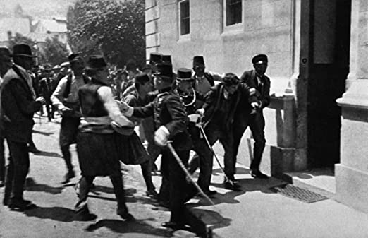 이에 세르비아계 민족주의자들이 결성한 비밀결사단체에서 대공부부에 대한 암살을 계획하고 실행에 옮기게 되는데요. 1914년 6월 28일 열차를 타고 보스니아에 도착한 대공 부부는 오전 10시를 조금 지난 시각에 일행과 함께 4대의 차를 타고 이동하게 됩니다. 처음으로 대공부부를 저격 하려던 무하메드 메드메흐바시치의 계획이 실패로 돌아가자 네델리코 차브리노비치가 차량 행렬을 향해 수류탄을 던집니다. 하지만 대공 부부가 탄 차가 지나간 다음에 폭발한 수류탄은 대공부부와 함께 움직이던 일행의 차량의 밑에서 터져 16명의 부상자를 발생시키게 되죠. 암살에 실패한 차브리노비치는 독을 마시고 목숨을 끊으려 했으나 경찰들에게 곧바로 체포되었다.